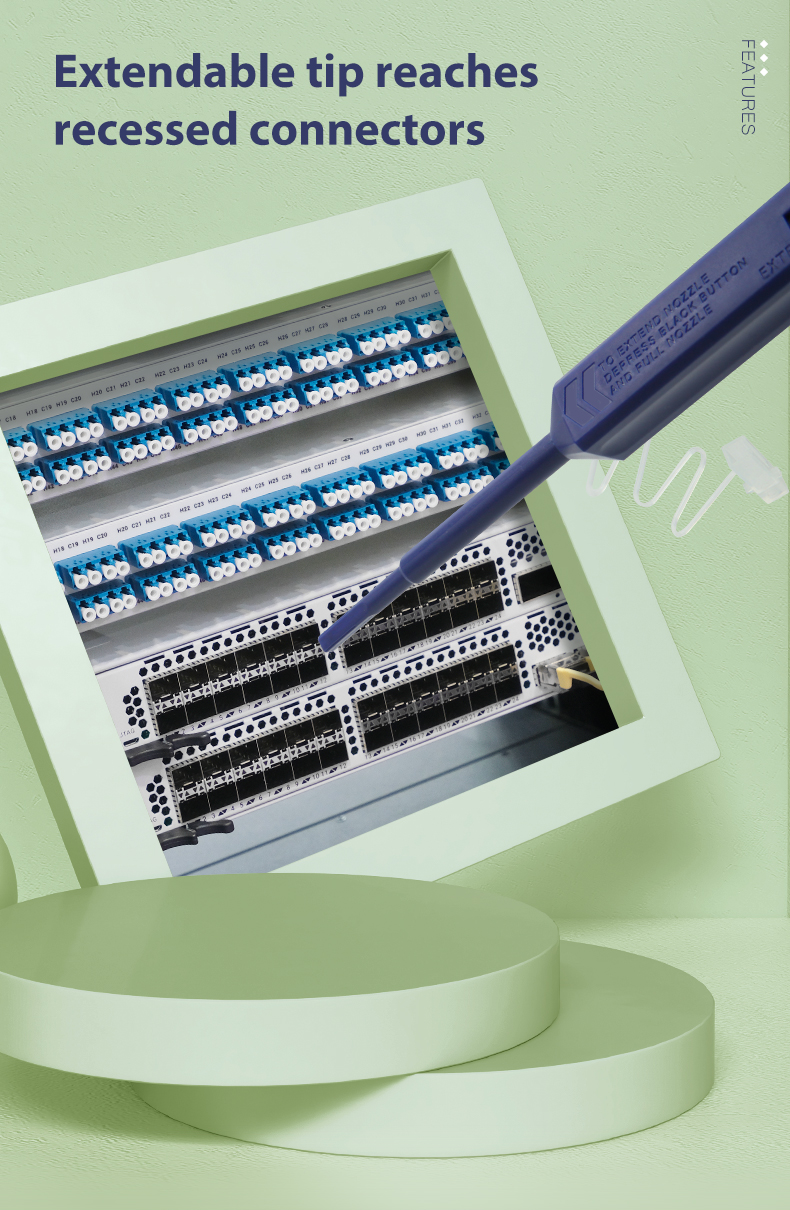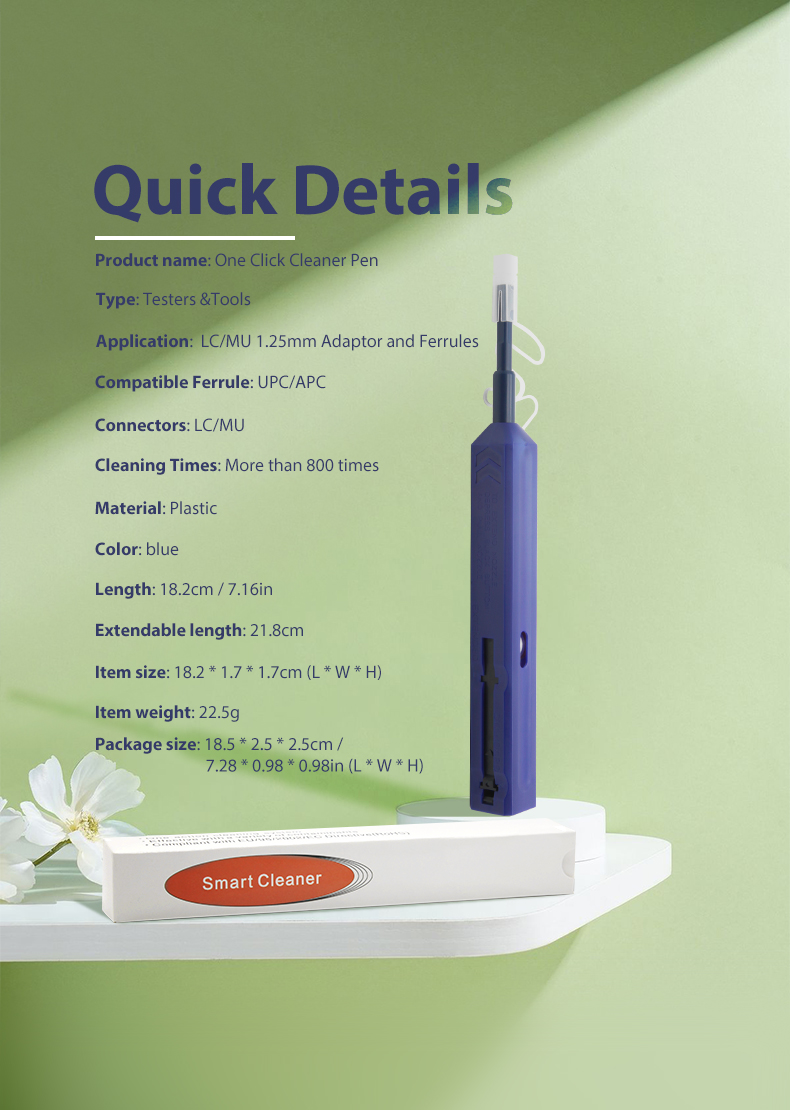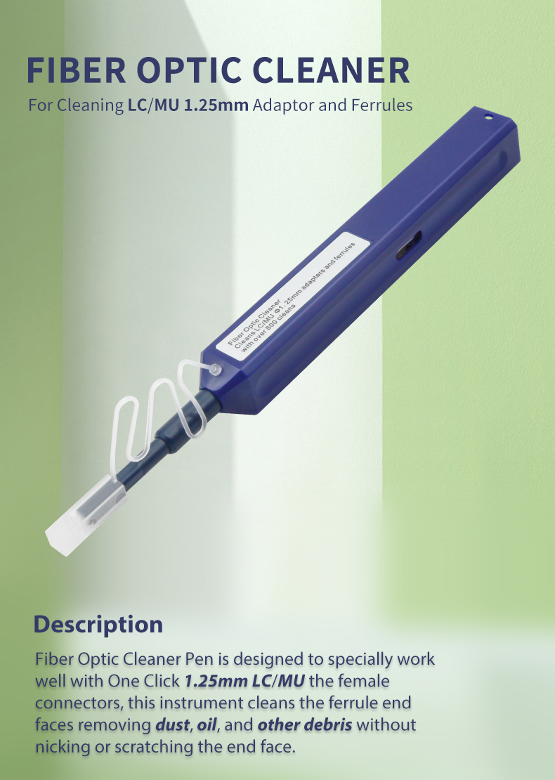 Fiber Optic Cleaner Pen is designed to specially work well with One Click 1.25mm LC MU the female connectors, this instrument cleans the ferrule end faces removing dust, oil, and other debris without nicking or scratching the end face.